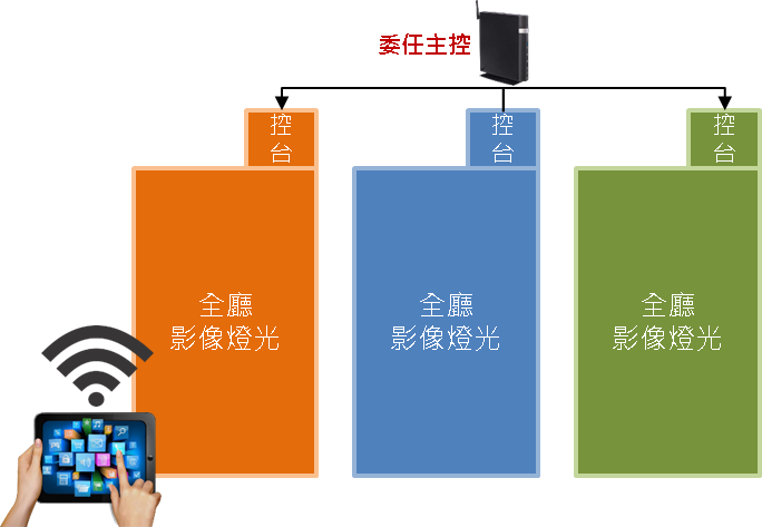 在多場域同步連控時,可委任其中一個控台當作主控台亦可以第三方